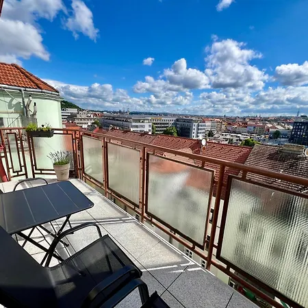 A Rooftop Prague View Apartment Prága Prága V. e körzetében található, kilátással a kertre. A vendégek üzleti vagy szabadidős igényeinek kielégítésére Wi-Fi áll rendelkezésre.